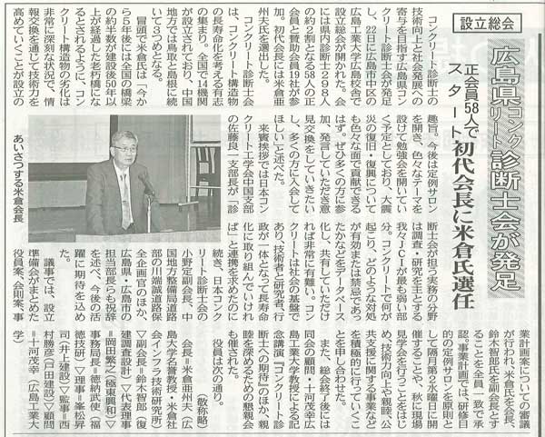 コンクリート診断土の技術向上と社会発展への寄与を目指す広島県コンクリート診断士会が発足し、22日に広島市中区の広島工業大学広島校舎で設立総会が開かれた。会には県内診断士298人の約2割となる58人の正会員と賛助会員19社が参加。初代会長には米倉亜州夫氏を選出した。
